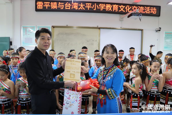 大新縣雷平鎮(zhèn)中心小學(xué)與臺(tái)灣花蓮太平小學(xué)交換禮品。(圖片來源:廣西臺(tái)辦)
