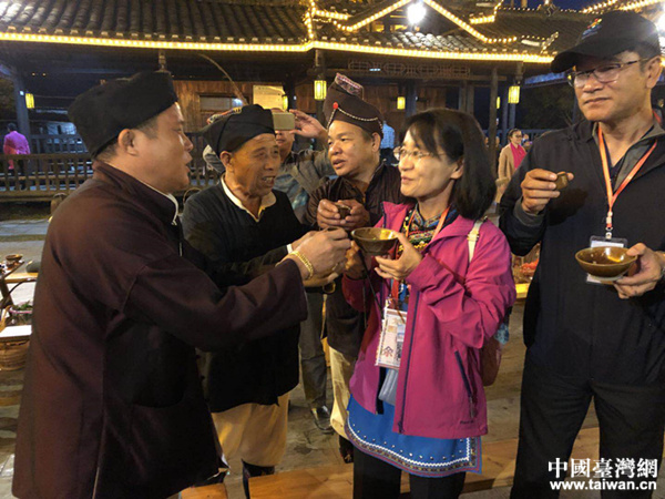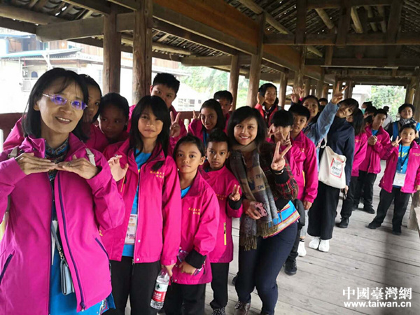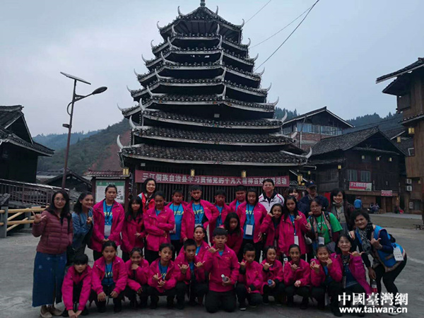 臺灣花蓮縣卓溪太平小學(xué)師生在三江冠小侗寨體驗民族風(fēng)情。(圖片來源:廣西臺辦)