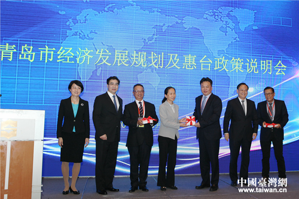 山東省省臺(tái)港奧辦、青島市政府領(lǐng)導(dǎo)向臺(tái)商代表發(fā)送青島市惠臺(tái)政策手冊(cè)。(圖片來源:青島市臺(tái)辦)