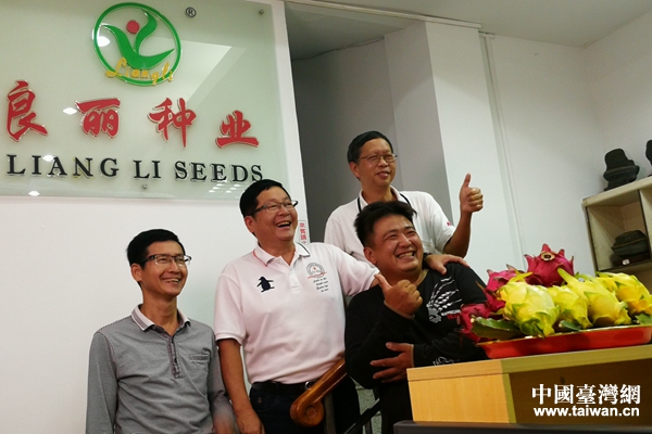 南寧市臺協(xié)副會長、南寧良麗種業(yè)公司董事長林金良與弟弟林水德、志同道合的臺灣農(nóng)業(yè)專家郭明生、陳勝得一起展露出“豐收喜悅”的甜蜜笑容。林金良表示,1992年來到南寧開展臺灣優(yōu)質(zhì)水果的培育、種植,培育出的大匯紅等優(yōu)質(zhì)紅(火)龍果在廣西得到大面積推廣種植,經(jīng)濟和社會效益良好,目前正在培育良麗金元寶黃龍果等新品種,很有成就感和滿足感。