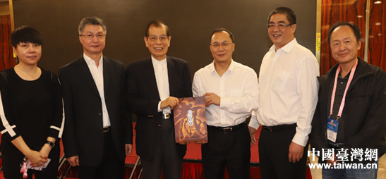 廣州市委常委、統(tǒng)戰(zhàn)部長盧一先與世界華商組織聯(lián)盟丁楷恩主席交換紀念品。(廣州市臺聯(lián) 駱源 攝)
