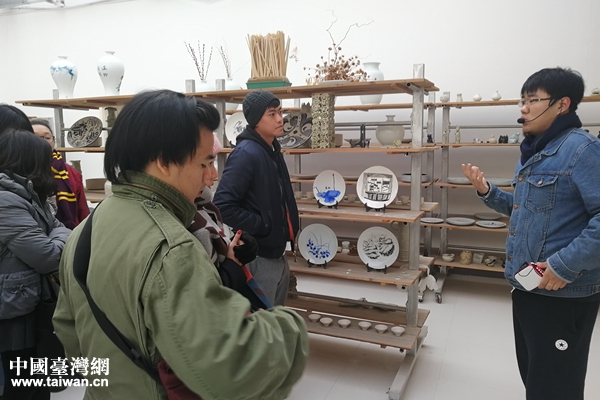 在學(xué)校學(xué)生的帶領(lǐng)下參訪團參觀美術(shù)與設(shè)計學(xué)院。(中國臺灣網(wǎng) 張露露 攝)