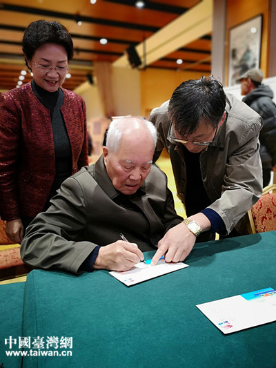 鄭堅在兩岸通郵十周年紀(jì)念郵票和郵封簽字留念。(中國臺灣網(wǎng) 郜利敏 攝)