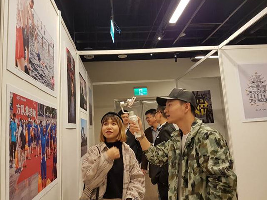 網(wǎng)紅與學(xué)生透過(guò)直播導(dǎo)覽整個(gè)展場(chǎng)。(圖片來(lái)源:武漢市臺(tái)辦)