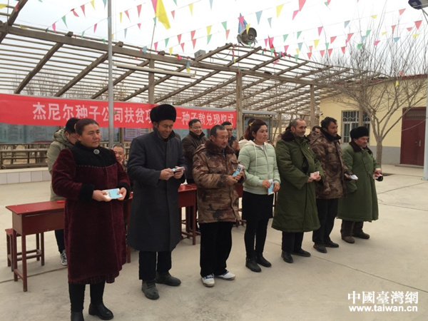中國臺灣網(wǎng)12月28日訊 24日,新疆生產(chǎn)建設(shè)兵團(tuán)農(nóng)十四師皮山農(nóng)場一連召開了一場特殊的儀式——“杰尼爾種子公司扶貧項目——種子款兌現(xiàn)儀式”;顒蝇F(xiàn)場,杰尼爾種子公司新疆片區(qū)負(fù)責(zé)人趙文言將78185元種子款送到一連7戶職工群眾手中。每戶得到了6100元至8600元不等的種子款。