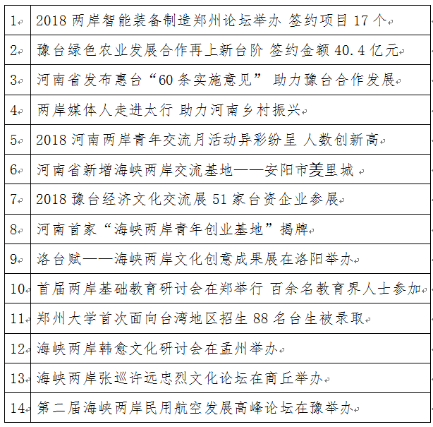 河南省“2018年全省涉臺十大新聞”候選新聞目錄