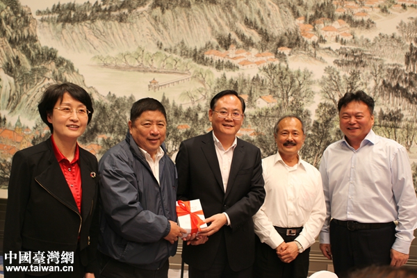10月25日,青島市委常委、統(tǒng)戰(zhàn)部部長(zhǎng)王久軍向全國(guó)臺(tái)企聯(lián)會(huì)長(zhǎng)王屏生等臺(tái)商代表贈(zèng)送新出臺(tái)的《關(guān)于促進(jìn)青臺(tái)經(jīng)濟(jì)文化交流合作的若干措施》。(圖片來(lái)源:青島市臺(tái)辦)