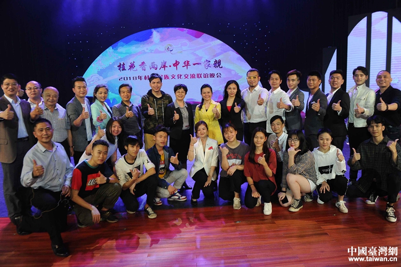 廣西臺辦主任李東興與桂臺各民族歡度“壯族三月三”聯(lián)誼晚會的參演臺商合影。(圖片來源:廣西南寧市臺辦)