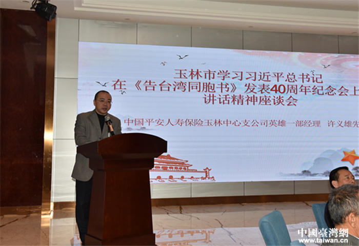 臺胞許義雄在玉林市學習習近平總書記在《告臺灣同胞書》發(fā)表40周年紀念會上的重要講話精神座談會上發(fā)言。(圖片來源:玉林臺辦)