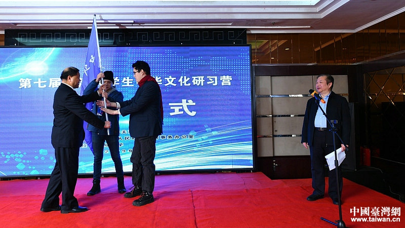 遼寧省臺辦副巡視員馬戈向研習(xí)營學(xué)生代表授予營旗。(圖片來源:遼寧省臺辦)