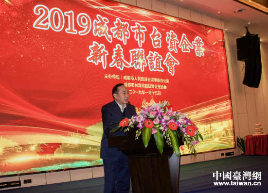 中國臺灣網(wǎng)1月18日成都訊 2019年1月16日,2019成都市臺資企業(yè)新春聯(lián)誼會舉行。省市有關(guān)部門負(fù)責(zé)人與在蓉臺商共計550余人歡聚一堂,喜迎新春。四川省臺辦主任羅治平、成都市委常委吳凱、成都市臺協(xié)會長徐大偉出席并致辭,成都市臺辦主任戴浚主持聯(lián)誼會。