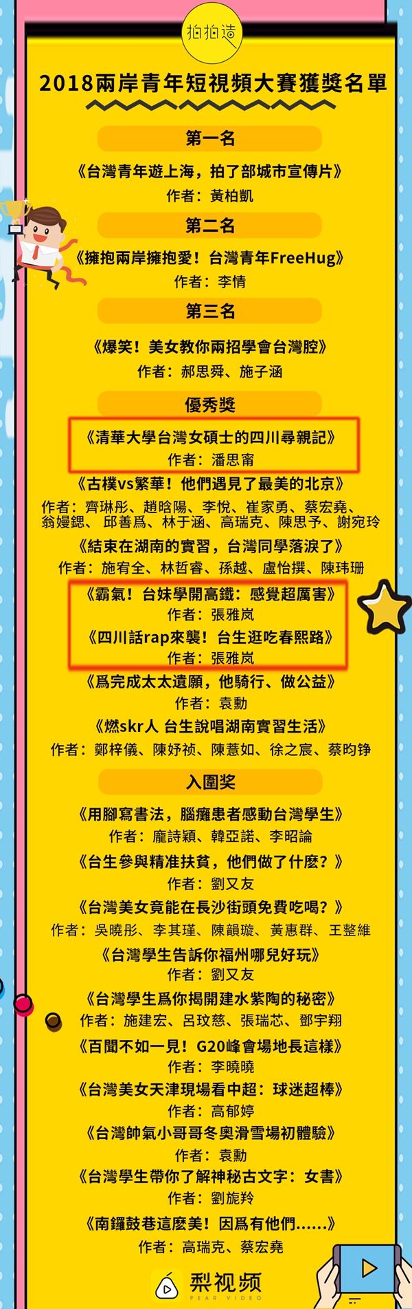 經(jīng)專業(yè)評委評分,綜合網(wǎng)友投票點贊和網(wǎng)絡(luò)點擊率、完播率等數(shù)據(jù),大賽決出一、二、三等獎各1名,并產(chǎn)生7名優(yōu)秀作品獎和10名入圍作品獎。其中,3部四川題材作品獲優(yōu)秀獎,分別是:臺青網(wǎng)紅“肆零”(潘思甯)的作品《清華大學(xué)臺灣女碩士的四川尋親記》和臺青網(wǎng)紅“雪梨”(張雅嵐)的作品《霸氣!臺妹學(xué)開高鐵:感覺超厲害》、《四川話rap來襲!臺生逛吃春熙路》。