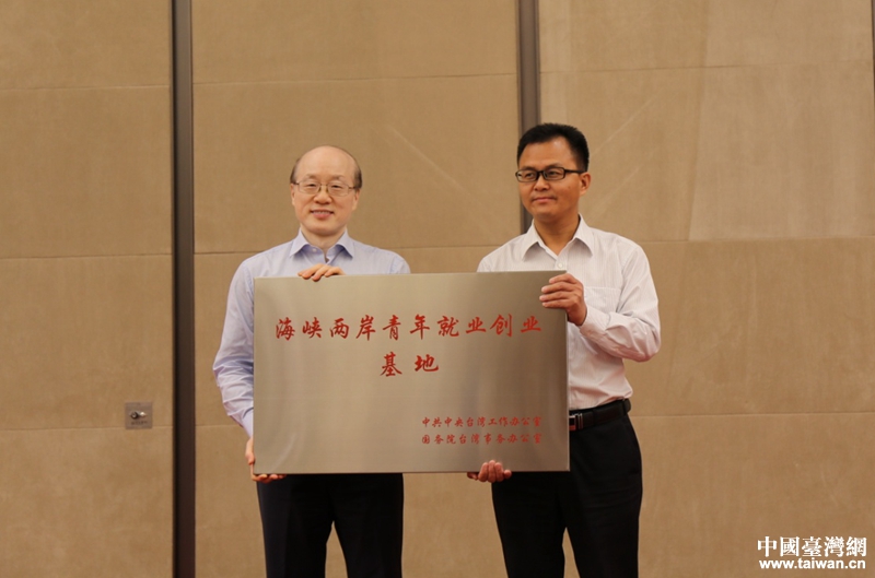 國臺辦主任劉結一向亞臺青海峽青年創(chuàng)業(yè)園授牌國家級“海峽兩岸青年創(chuàng)新創(chuàng)業(yè)基地”。(圖片來源:四川省臺辦)