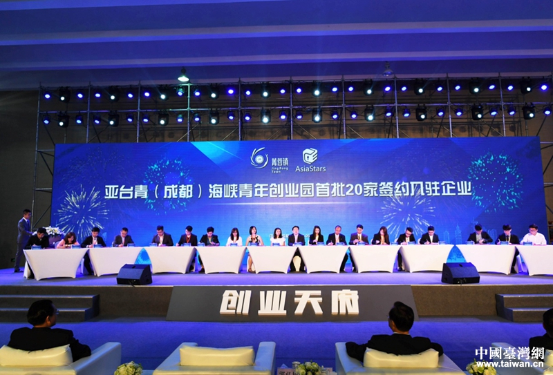 亞臺青(成都)海峽青年創(chuàng)業(yè)20家入駐企業(yè)簽約儀式。(圖片來源:四川省臺辦)