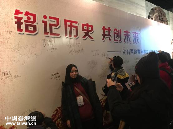 在剛剛獲批為遼寧省對臺交流基地的“九·一八”歷史博物館,同學們看到了上百幅真實的歷史照片及慘無人道的刑罰工具,通過講解員的敘述了解中華民族浴血奮戰(zhàn)、不屈不撓的抗戰(zhàn)史,引起了臺灣青年們強烈的共鳴。在隨后的沈臺兩地青年學生勵志簽名活動中,在場的兩岸大學生紛紛在印有“銘記歷史,共創(chuàng)未來”的長卷上留下“懷一顆心,念我千古華夏人,勿忘國恥”“振興中華,共創(chuàng)和平”“期盼和平長存”等勵志簽名,表達共同心聲。