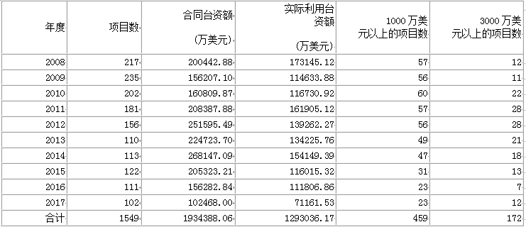 經(jīng)過(guò)山東省方方面面的共同努力,山東對(duì)臺(tái)經(jīng)貿(mào)交流合作邁入融合推進(jìn)的新階段,魯臺(tái)經(jīng)貿(mào)合作不斷深化,規(guī)模持續(xù)擴(kuò)大、領(lǐng)域不斷拓展、質(zhì)量穩(wěn)步提升,2008年-2017年山東省批準(zhǔn)臺(tái)資項(xiàng)目1549個(gè),合同臺(tái)資193.4億美元,實(shí)際利用臺(tái)資129.3億美元,臺(tái)資項(xiàng)目質(zhì)量明顯提高,大項(xiàng)目增多,截至2017年底,山東省總投資1000萬(wàn)美元以上的臺(tái)資項(xiàng)目共1057個(gè),其中總投資額在3000萬(wàn)美元以上項(xiàng)目210個(gè)。