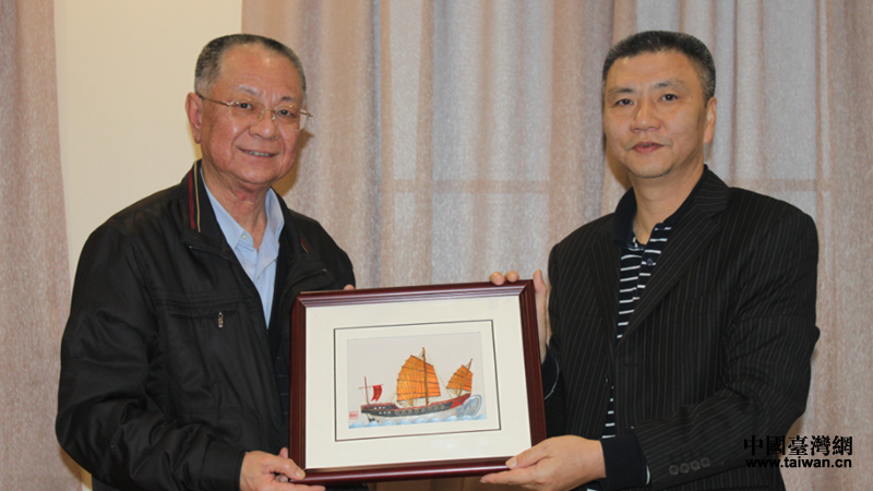 汕頭市臺辦主任高耿浩(右)向交流團代表前澎湖縣馬公市市長蘇崑雄(左)贈送紀念品。(圖片來源:汕頭市臺辦宣傳交流科)
