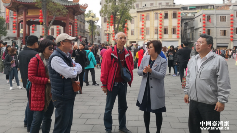 金平區(qū)委常委、統(tǒng)戰(zhàn)部部長丁丹霞(右2)向交流團介紹小公園開埠區(qū)保育活化情況。(圖片來源:汕頭市臺辦宣傳交流科)