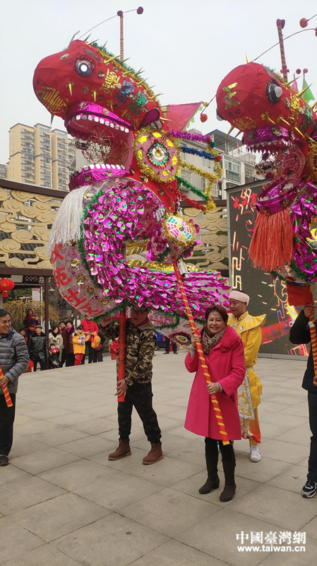 參訪團在江欣苑社區(qū)體驗高龍。(圖片來源:武漢市臺辦 王瑋 攝)