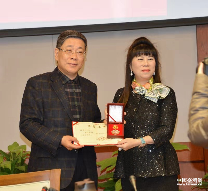 上海市臺(tái)辦主任李文輝為獲得2017-2018年度上海市三八紅旗手的臺(tái)胞頒發(fā)榮譽(yù)證書(shū)。(圖片來(lái)源:上海市臺(tái)辦)