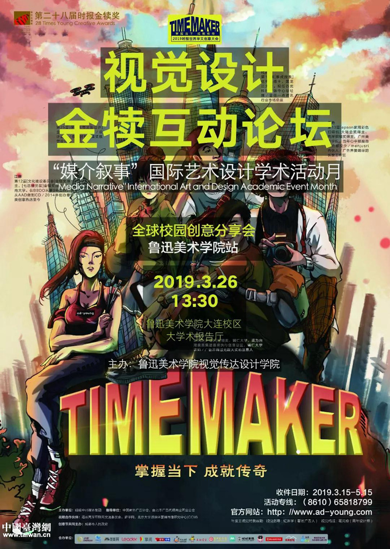 中國(guó)臺(tái)灣網(wǎng)4月1日大連訊 3月26日,“Time Maker—掌握當(dāng)下,成就傳奇”——時(shí)報(bào)世界華文創(chuàng)意大會(huì)、第二十八屆時(shí)報(bào)金犢獎(jiǎng)全球校園創(chuàng)意分享會(huì)在魯迅美術(shù)學(xué)院大連校區(qū)一號(hào)學(xué)術(shù)報(bào)告廳舉辦。分享會(huì)上,金犢獎(jiǎng)組委會(huì)代表、旺旺中時(shí)文化傳媒總監(jiān)林洛安先生為魯迅美術(shù)學(xué)院頒發(fā)感謝狀。創(chuàng)意分享嘉賓李三水老師向各高校教師代表頒發(fā)了榮譽(yù)聘書(shū),并結(jié)合案例為師生們開(kāi)展了一次“不做創(chuàng)意人,只做創(chuàng)造者”的主題演講。