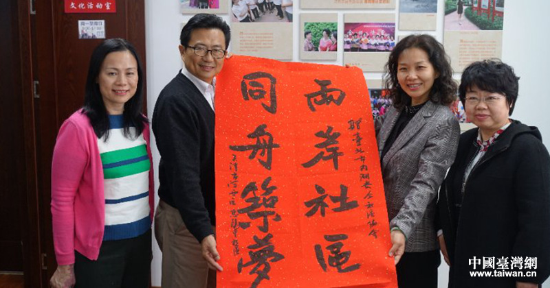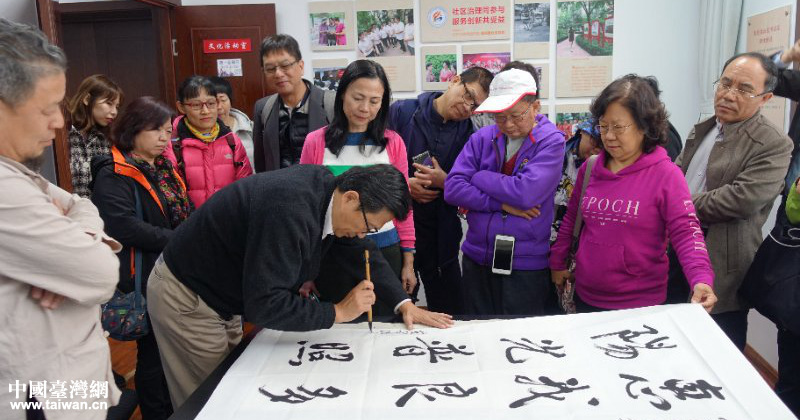 訪問(wèn)團(tuán)在欣賞社區(qū)文藝隊(duì)精心準(zhǔn)備的詩(shī)朗誦《讀中國(guó)》、二重唱《外婆的澎湖灣》、民樂(lè)齊奏等極具中國(guó)風(fēng)的文藝節(jié)目時(shí),與社區(qū)居民一起聯(lián)歡互動(dòng),感受骨肉親情。在書畫活動(dòng)室,來(lái)賓們向剪紙愛(ài)好者饒有興致地學(xué)習(xí)剪紙技藝,社區(qū)居民們向遠(yuǎn)道而來(lái)的客人贈(zèng)送“!弊旨艏埍磉_(dá)美好祝愿。在書法交流活動(dòng)現(xiàn)場(chǎng),社區(qū)書法愛(ài)好者書寫“兩岸社區(qū)同舟筑夢(mèng)”“兩岸一家血濃于水”等書法作品贈(zèng)送臺(tái)灣客人,訪問(wèn)團(tuán)成員、臺(tái)北市議員吳世正先生現(xiàn)場(chǎng)揮毫,題寫“惠我良多陽(yáng)光普照”的藏頭書法作品贈(zèng)與惠陽(yáng)里社區(qū),兩岸同胞心靈契合躍然紙上。