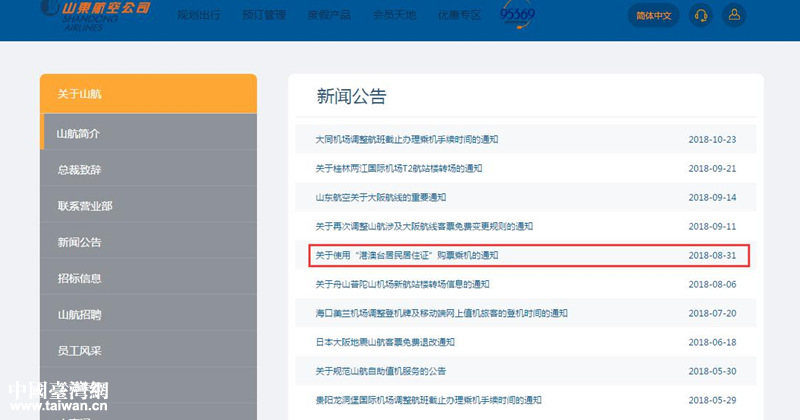 山航通過官網(wǎng)等平臺向社會公眾告知惠臺政策和有關規(guī)定。(圖片來源:山東省臺港澳辦)