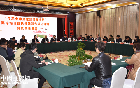 姓氏文化講座現(xiàn)場。周口市姓氏文化研究會會長李軍法向兩岸媒體記者講解中原姓氏文化的起源、發(fā)展及現(xiàn)狀。(圖片來源:周口市臺辦)