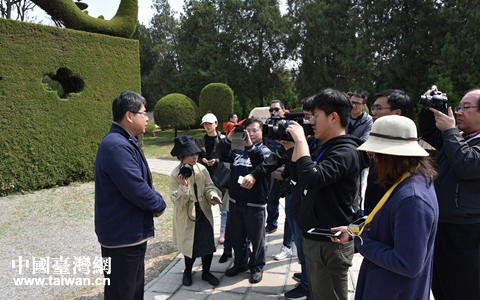 淮陽太昊陵管理處主任雷鐵梁向兩岸媒體記者介紹伏羲文化和姓氏文化。(圖片來源:周口市臺辦)