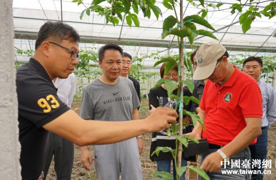 在安龍縣大秦農旅文化發(fā)展有限公司基地大棚內調研“百香果”種植。(圖片來源:貴州省臺辦經(jīng)濟處)
