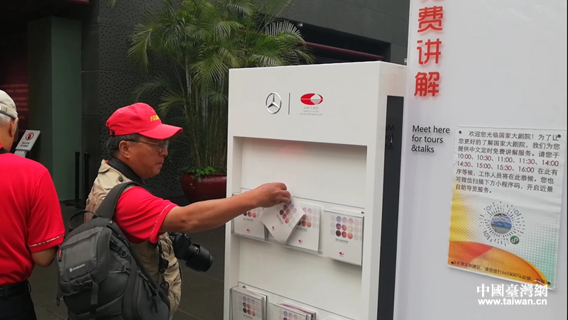 國(guó)家大劇院內(nèi),參訪團(tuán)成員觀看講解圖冊(cè)。(中國(guó)臺(tái)灣網(wǎng) 張露露 攝)