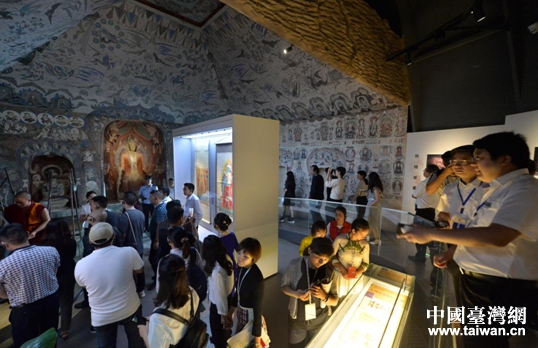 兩岸嘉賓參觀張大千博物館內(nèi)現(xiàn)場(chǎng)實(shí)景復(fù)原的“敦煌石窟”。(圖片來源:四川省臺(tái)辦)