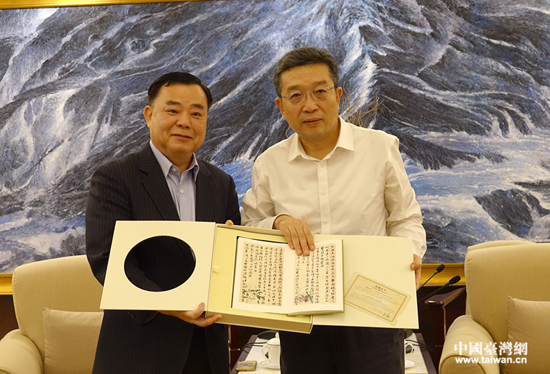 中共上海市委常委鄭鋼淼會見桃園市議會議長邱奕勝率領的桃園市里長聯(lián)誼總會參訪團一行。圖為雙方交換禮物。(來源:上海市臺辦)