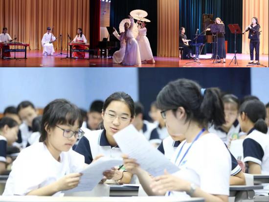 隨后,“同唱一首歌”音樂交流活動,在黃橋中學西林禮堂激情上演。在《相親相愛一家人》的動人旋律中,演出拉開帷幕。新北高中的同學們個個才藝不凡,鋼琴、小提琴、中提琴、長號、單簧管演奏,閃亮登場,異彩紛呈。尤其是小提琴獨奏馬思聰?shù)摹端监l(xiāng)曲》,充滿懷念和憂傷的情調(diào),令人無不動容。黃橋中學參演的節(jié)目更具民族風情和傳統(tǒng)文化氣息。二胡、古箏、古典舞、錫劇表演,充分展示出同學們的才情和風采。整場演出,可謂中西合璧、古今交融,沉靜優(yōu)美的旋律在西林禮堂大廳久久回蕩,在每一個人的心頭靜靜流淌……
