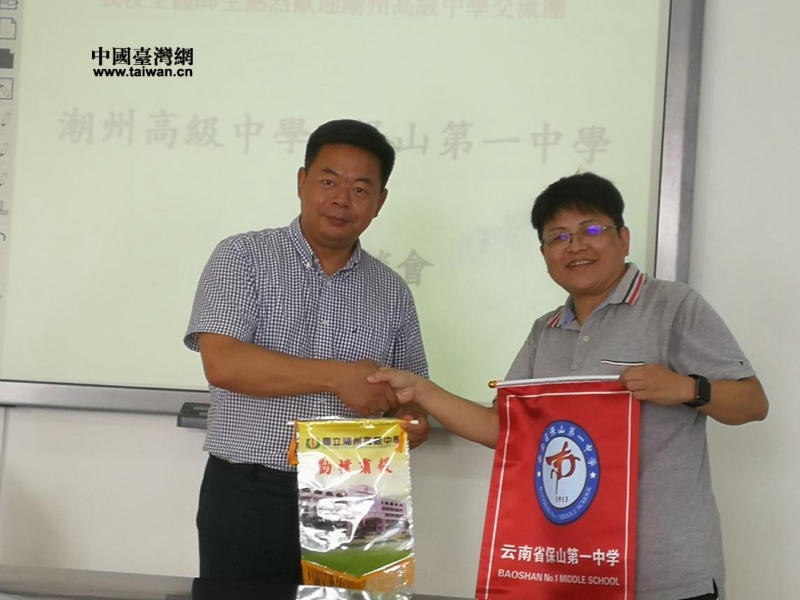保山第一中學(xué)校長(zhǎng)陳圣日和臺(tái)灣潮州高級(jí)中學(xué)交流團(tuán)團(tuán)長(zhǎng)蔡季延互贈(zèng)校旗。(圖片來(lái)源:云南省臺(tái)辦)