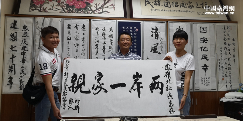 團員張宗麟書寫一幅“兩岸一家親”書法贈送鳳嶺北社區(qū)(圖片來源:廣西南寧市臺辦)