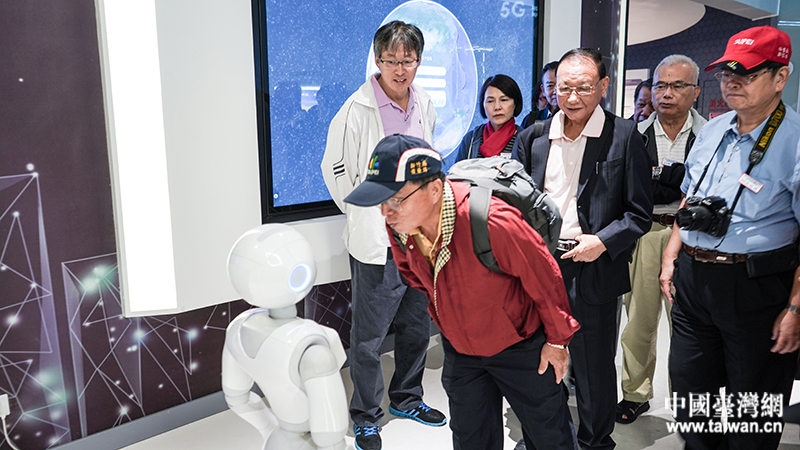 臺北市臺澎金馬各縣市同鄉(xiāng)會總干事聯(lián)誼會參訪團(tuán)與5G智能機(jī)器人互動。(圖片來源:北京市臺聯(lián))