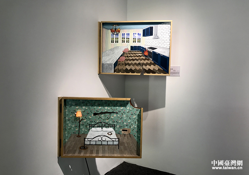 據(jù)介紹,此次聯(lián)展共有臺灣5所高校的84位同學作品參展。記者在現(xiàn)場看到,高雄師范大學的許玟蒂帶來了用復(fù)合材料制作的兩幅畫作《早餐》和《該睡了》。其畫作于舒適環(huán)境畫面中以威脅性方式破壞畫面的安寧,以表達青年人在工業(yè)化、科技化文明便利和秩序中隱含的不安和焦慮。