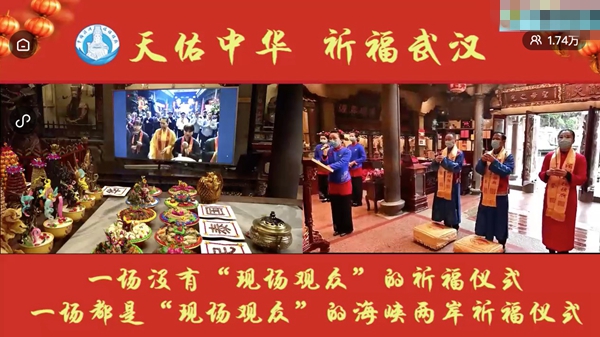 隔著一灣淺淺的海峽,兩岸宮廟在視頻屏幕中共同舉行莊嚴肅穆的三獻禮。林金贊說:“兩岸一家親,今天兩岸媽祖宮廟通過網(wǎng)絡連線,共同舉行“天佑中華 祈福武漢”活動,祈愿中華民族繁榮昌盛,疫情早日解除!”。