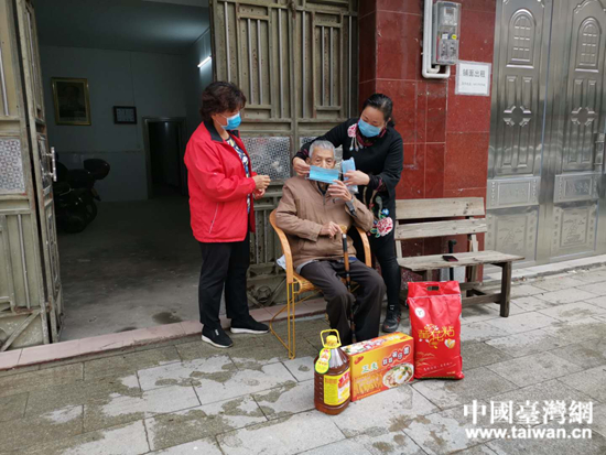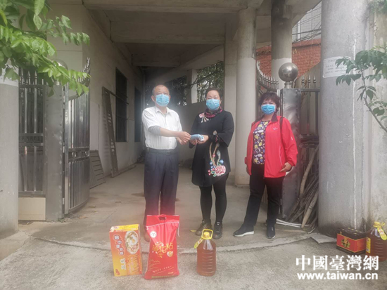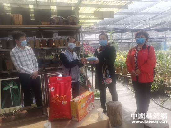 廣西玉林市容縣臺辦主任曾漢萍到臺胞葉國斌蘭花園走訪,送上口罩和生活物資。 (中國臺灣網(wǎng) 發(fā))