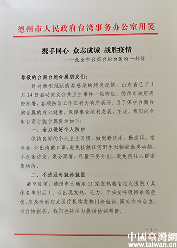 德州市臺辦還向臺商臺胞臺屬發(fā)出一封信,呼吁他們做好防護、配合聯(lián)防聯(lián)控、穩(wěn)慎開業(yè)復(fù)工、加強涉外風(fēng)險管理,并提供肺炎醫(yī)療救助定點醫(yī)院、發(fā)熱門診信息。