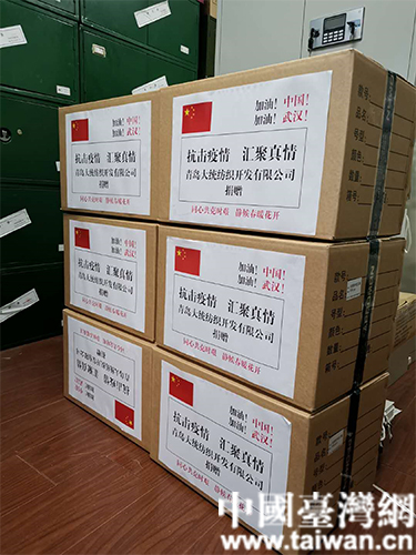 “同心共克時艱,靜候春暖花開”,一行溫暖的字寫在臺資企業(yè)青島大統(tǒng)紡織開發(fā)有限公司捐贈物資的包裝上。(圖片來源:山東省臺港澳辦)