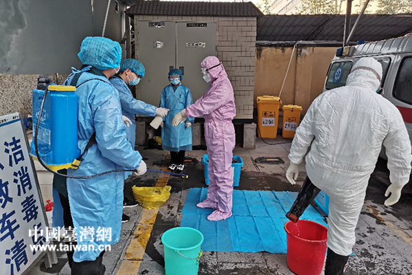 陶怡秀(左三)培訓(xùn)醫(yī)護(hù)人員用負(fù)壓救護(hù)車接回新冠病人后的消毒工作。(圖片來源:陜西省臺聯(lián))