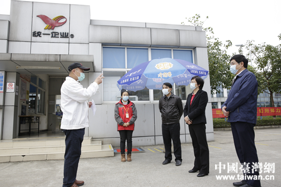 李東興、趙宏明在南寧統(tǒng)一企業(yè)有限公司查看企業(yè)防護(hù)措施和防控物資儲(chǔ)備情況。 (中國(guó)臺(tái)灣網(wǎng) 發(fā))