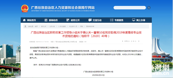 中國(guó)臺(tái)灣網(wǎng)2月28日訊 據(jù)廣西壯族自治區(qū)人力資源和社會(huì)保障廳消息,廣西壯族自治區(qū)職稱改革工作領(lǐng)導(dǎo)小組評(píng)審確認(rèn)10位同志取得2019年廣西高級(jí)專業(yè)技術(shù)資格,其中包含4名臺(tái)籍教師。