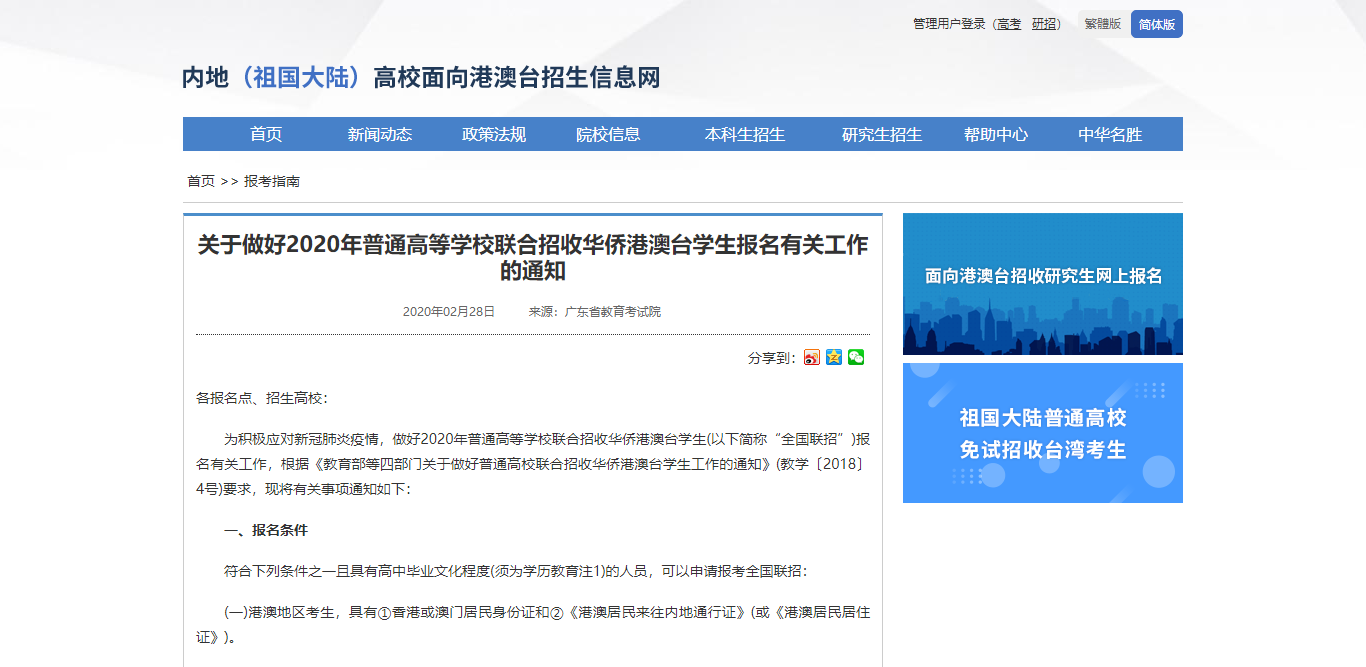 通知指出,大陸2020年普通高校聯(lián)合招收華僑港澳臺學(xué)生(以下簡稱“全國聯(lián)招”)報(bào)考條件、網(wǎng)上報(bào)名時(shí)間與往年一致。符合報(bào)名條件的考生須在3月1日-15日登錄全國聯(lián)招管理系統(tǒng)(網(wǎng)址:https://www.eeagd.edu.cn/lzks)完成網(wǎng)上報(bào)名。