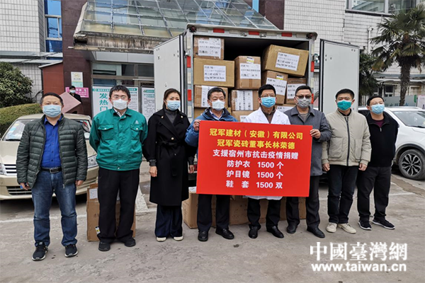 2月29日,臺企冠軍建材(安徽)有限公司向宿州市立醫(yī)院捐贈防護服1500件、護目鏡1500個、鞋套1500雙,總價值19萬余元。(圖片來源:宿州市臺辦)