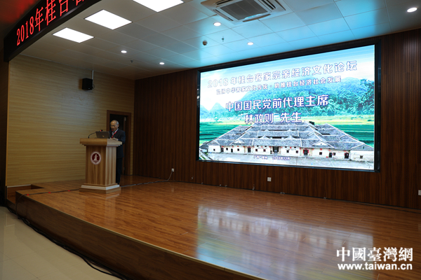 2018年12月,林政則出席桂臺客家宗親經濟文化論壇并致辭。 (中國臺灣網 發(fā))