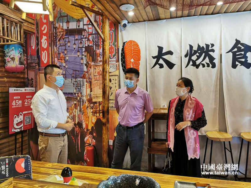丘德彬(中)與太燃臺式日料店負(fù)責(zé)人陳立軒(左)交流(圖片來源:廣西南寧市臺辦)