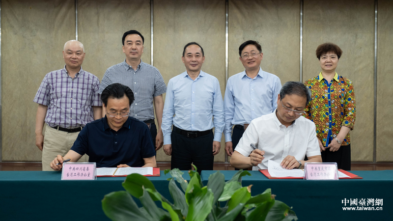 四川省臺辦主任羅治平(二排左三)、重慶市臺辦主任陳全(二排右二)見證雙方代表簽訂框架協(xié)議。(圖片來源:四川省臺辦)